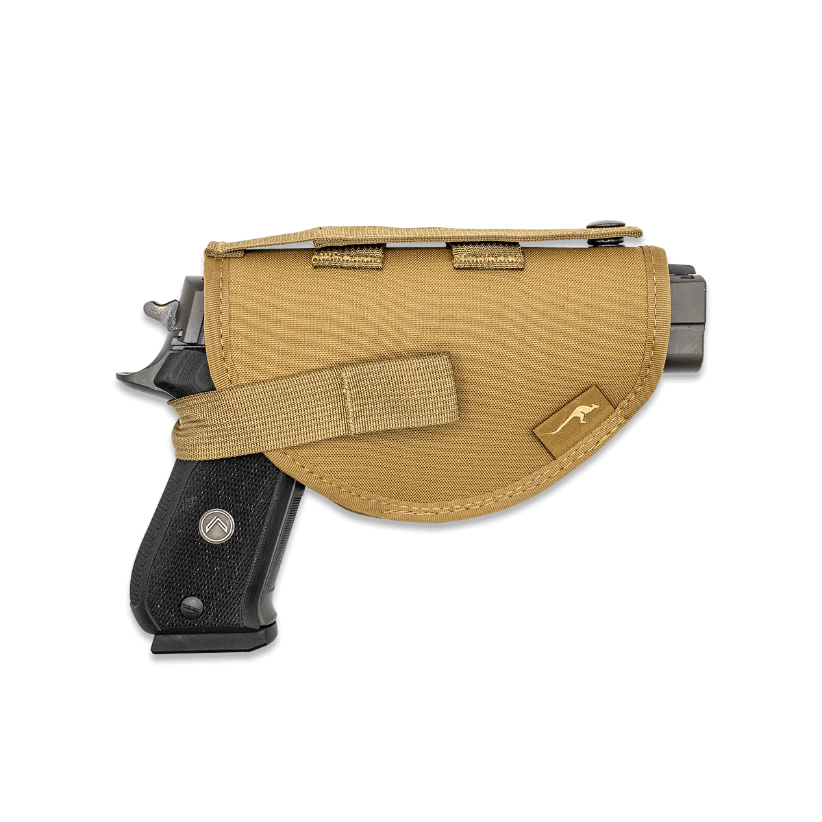 Your firearm stays readily available and secure in a structured/padded holster. Adjustable in size, the holster fits a wide variety of handguns and revolvers. Soft loop velcro material lines the holster's inside, allowing the retention strap to be adjusted for tightness. A ring snap secures the strap and can be released with a quick pull on the release loop. Attaches to the bottom Molle Webbing on Marsupial Gear Chest Packs. Does not interfere with side pouch attachments.