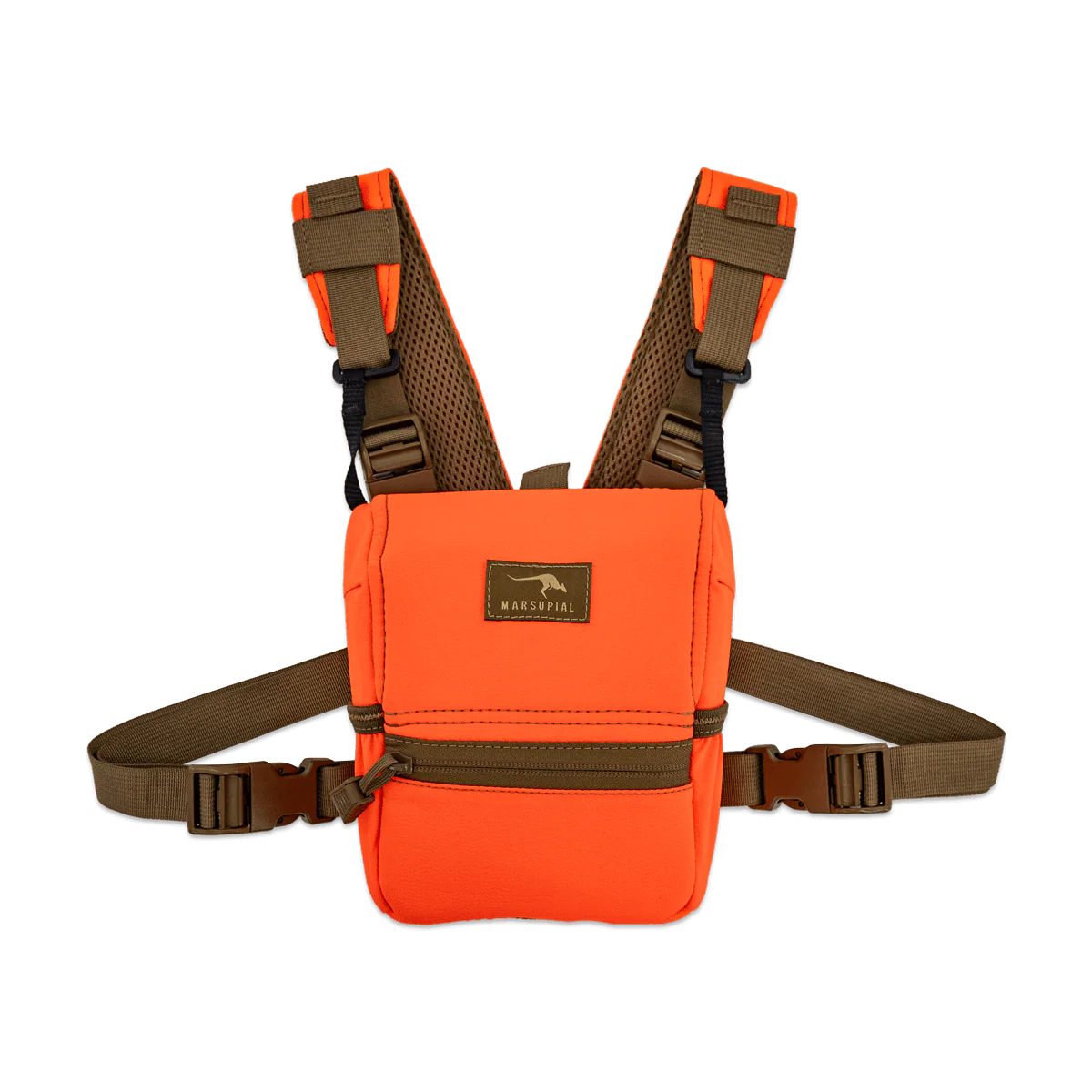 Years of feedback and testing have led to the design and creation of our Enclosed Binocular Pack. Utilizing state-of-the-art fabrics and features, the Enclosed Binocular Pack offers the same one-handed operation Marsupial Gear is known for. This pack uses our trademark front folding magnetic lid design but adds another layer of protection Compared to the Standard Binocular Pack. Taller sidewalls and overlapping wings fully seal and protect your binoculars from the elements. MOLLE webbing on the bottom of the pack offers additional accessory attachment points. The durable stretch fabric offers more storage in the front and side pockets. Our modular design allows you to customize your chest pack with a wide array of accessories.