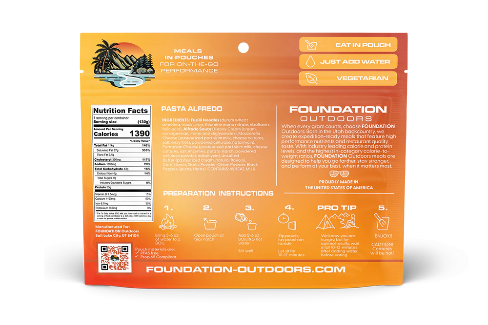 Our Pasta Alfredo Performance Meal redefines what you should expect from a vegetarian meal. This savory entree features fusilli pasta smothered in a creamy parmesan cheese sauce. At 55g of protein, this meal is stacking industry leading macros and leaving the competition in the dust of the PCT.