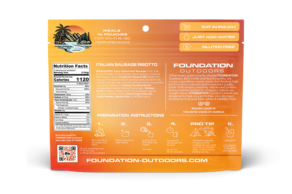FOUNDATION Outdoors bold spicy Italian pork sausage, crumbled and seared, over a creamy bed of risotto. Each forkful delivers a warming kick, balanced by the sweet, earthy notes of tender butternut squash woven throughout the rich, al dente rice.